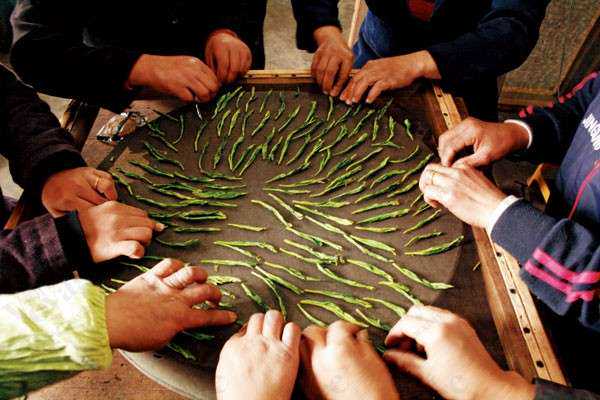 将2~3克茶叶集中成一束,在基部扎紧,做成牡丹形,如安徽黄山的绿牡丹。