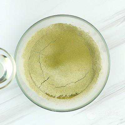 2、再筛入低筋面粉100g、抹茶粉10g,倒入植物油25ml,搅拌均匀