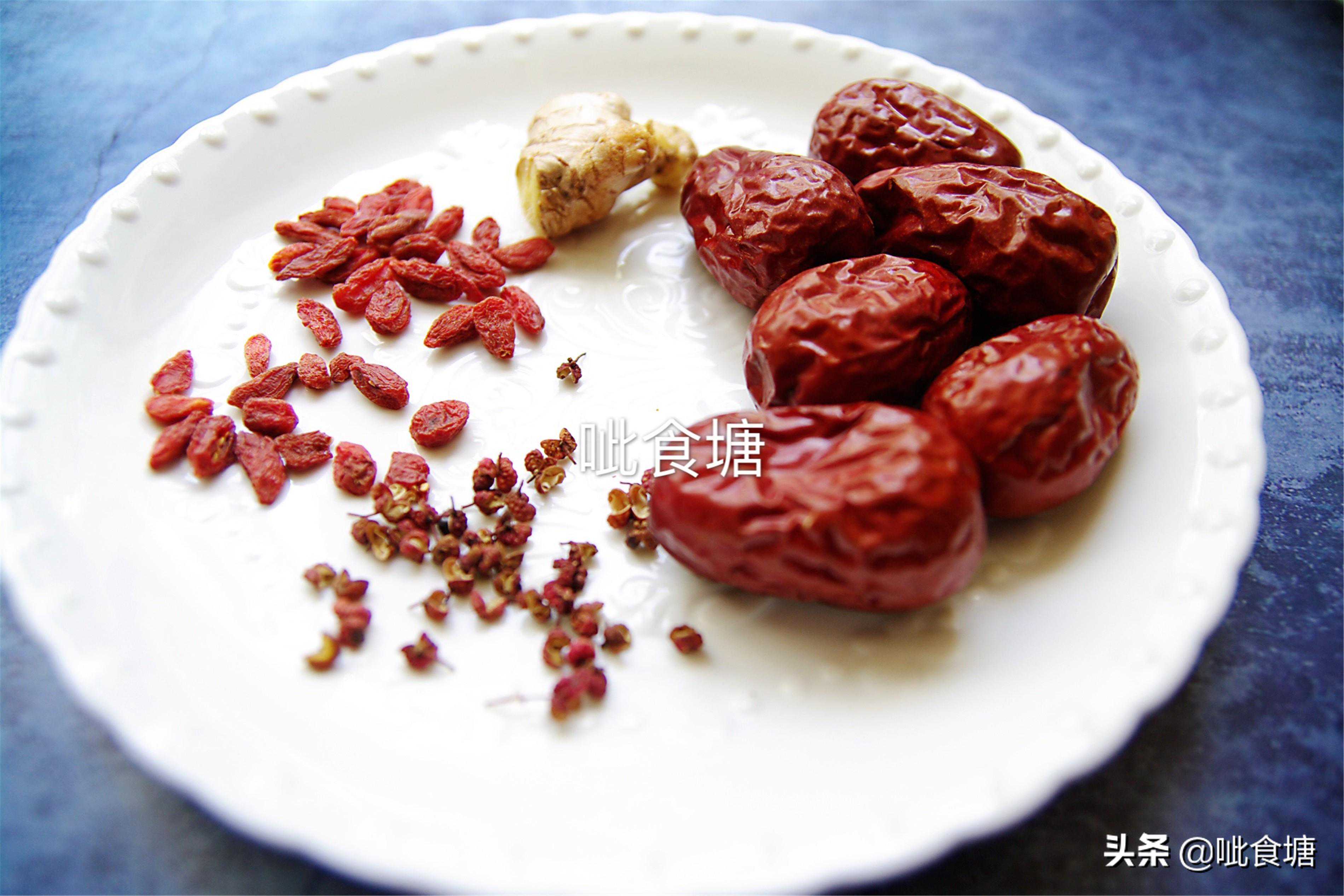 6粒大枣、6颗桂圆、十几粒花椒、半块生姜、一小把枸杞、一块红糖