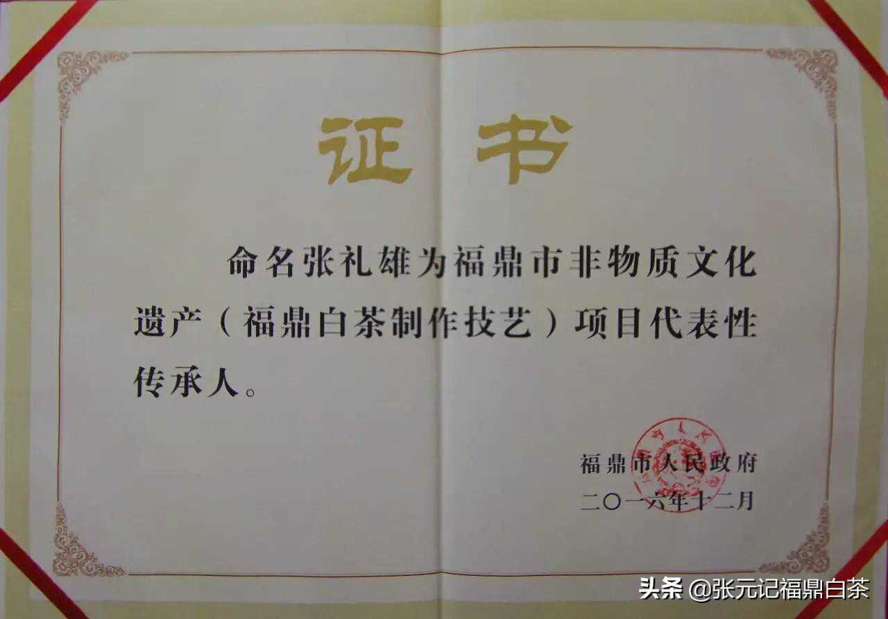 2016年11月,张元记第五代张礼雄被福鼎市政府评定为“非物质文化遗产福鼎白茶制作技艺传承人”
