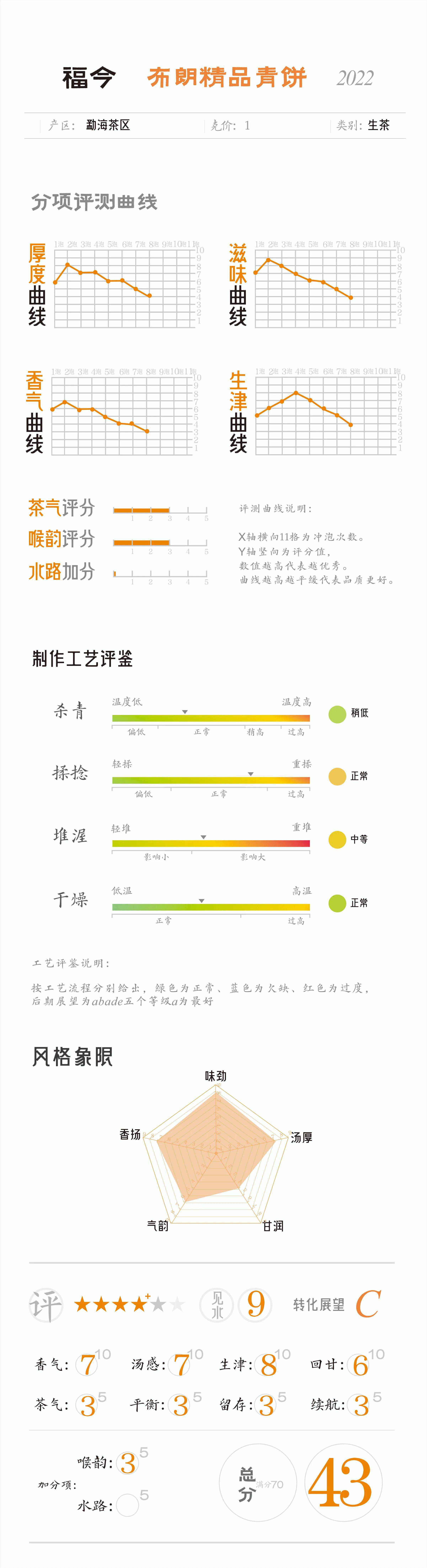 入口烟较浓郁,苦底较强,能化。生津快速,涩感中等,偏向浓俨风格,茶气出现,回甘显。涩感稍有粘舌,厚度中等,水路显粗,舌面收敛感与生津混合,生津感比较持续